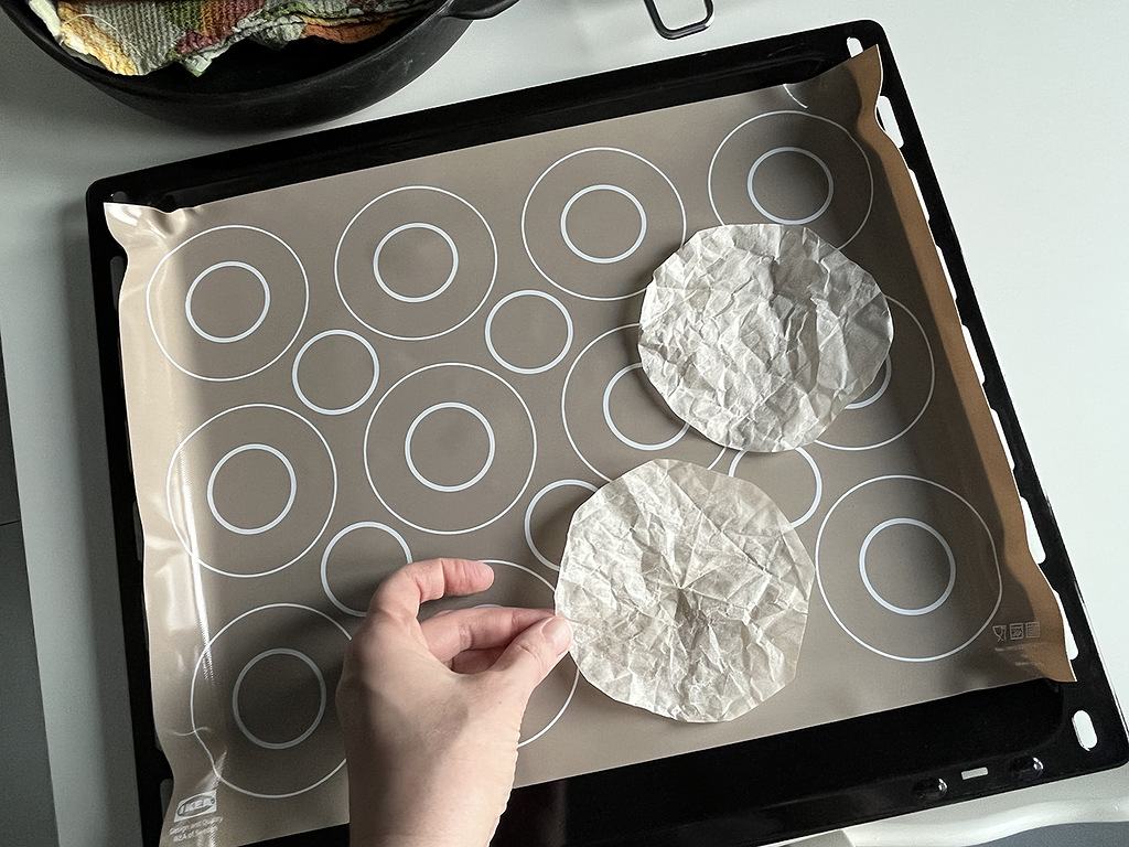 Быстро выложить лепёшки теста на противень — лепёшки должны быть одинакового размера, если вы не задумали другого варианта.