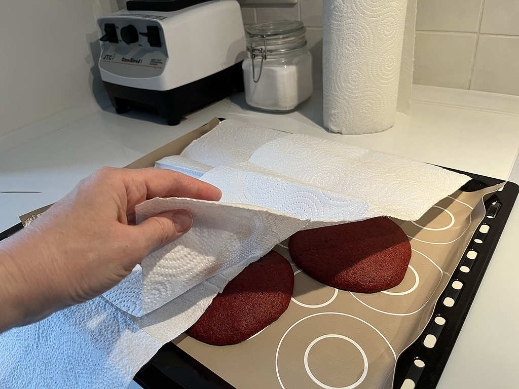 Противень с готовыми бисквитами накрыть бумажными полотенцами и дать остыть — на это уйдёт где-то 30 минут.