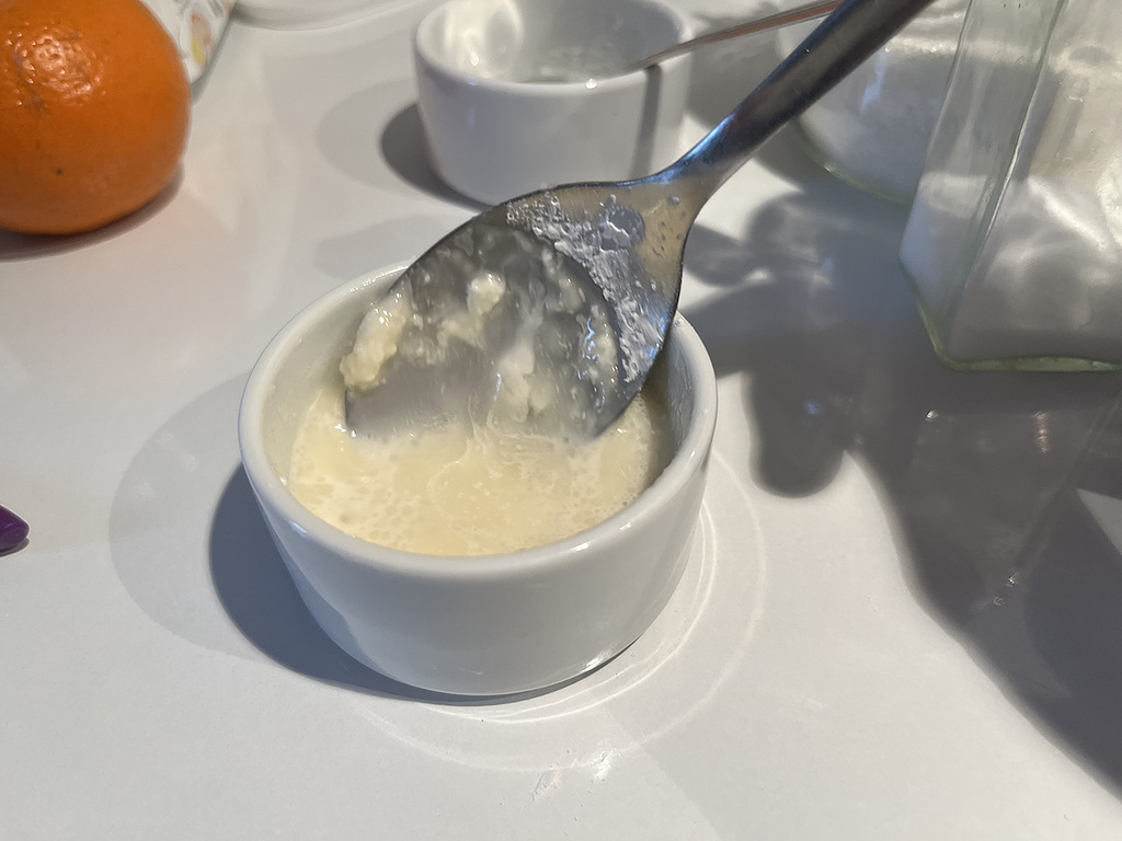 - 130 г овсяного молока “Овсяша” комнатной температуры (жирность любая) — отмерить можно в баночке (200 г) из-под тофу-пасты Casa Kubana или паштета Extra Vegan: овсяное молоко должно почти доходить до начала сгиба, ведущего к резьбе на горлышке у баночки (см. фото),