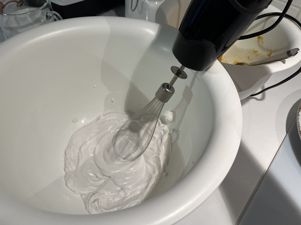 Белки двух яиц отделяют от желтков и, добавив 40 г сахара, щепоть соли, взбивают при больших оборотах миксера, пока появятся плотные белые пики.
