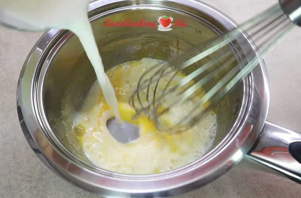 - Закипятить молоко, всыпать 100 г сахара, ванилин, влить разведенный водой крахмал. Остудить смесь.