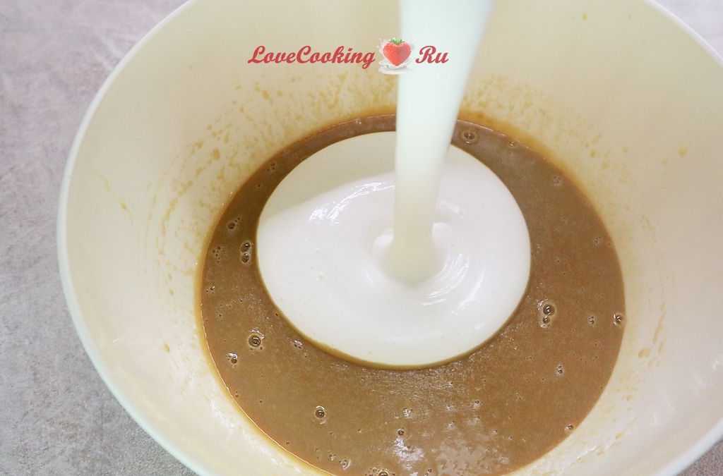 - Смешиваем белки с желтками и постепенно добавляем муку, разрыхлитель, крахмал и какао. Тесто получается густым, потому перемешивать его нужно очень аккуратно.
