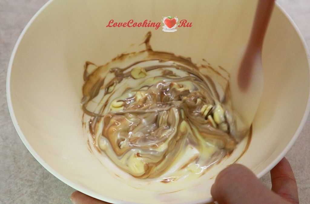 - Шоколад топим на водяной бане и добавляем в творожную массу, снова перебиваем.
