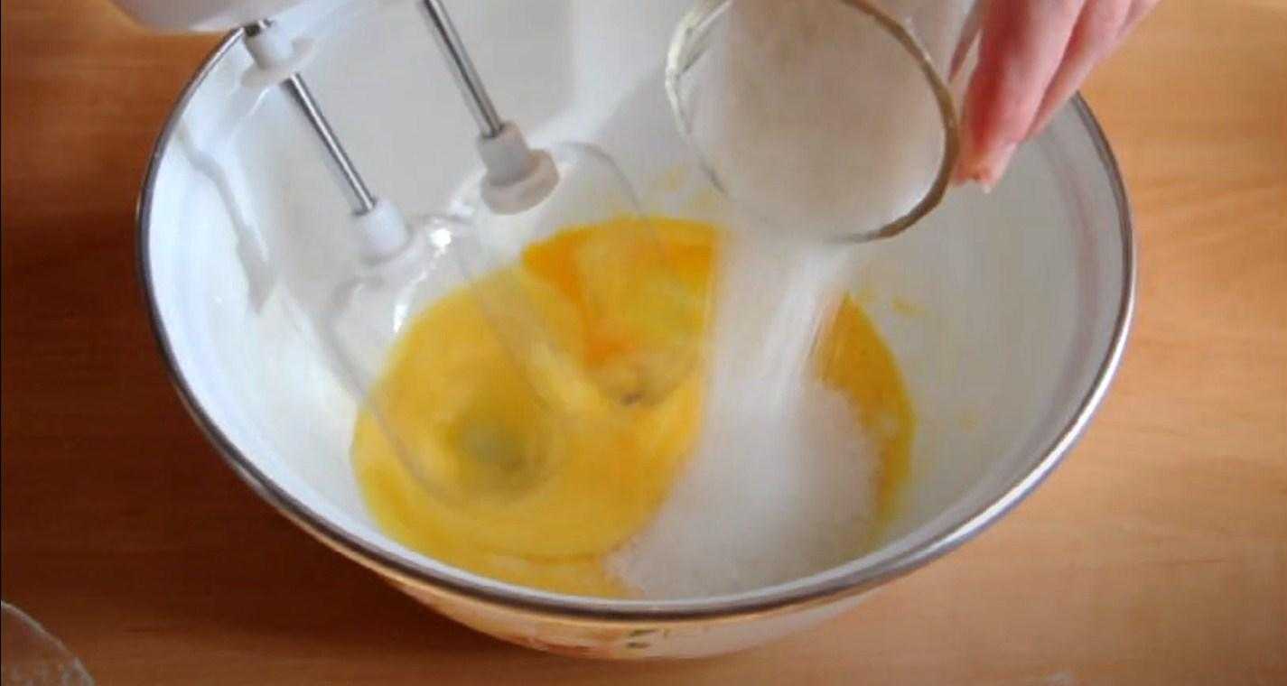 - Постепенно подсыпаем к взбитым яйцам 185 грамм сахара и взбиваем. Нам нужно, чтобы все крупинки максимально растворились.