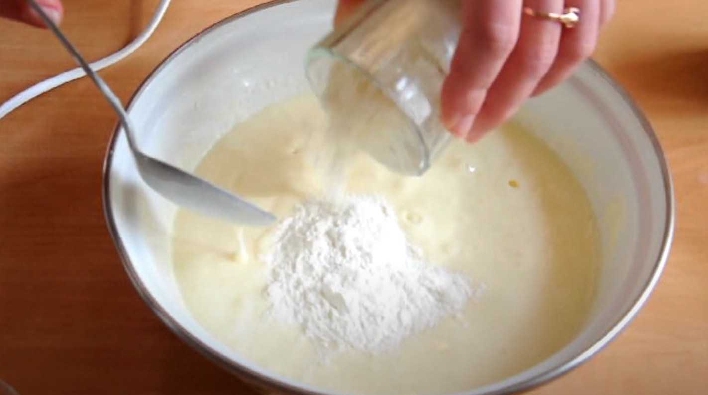 - К полученной смеси постепенно подсыпаем 70 грамм муки и перемешиваем.