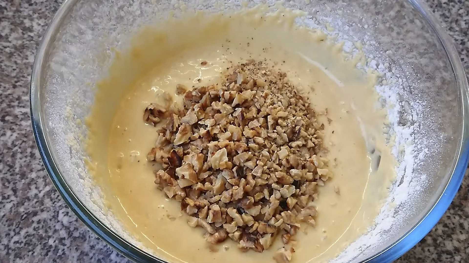 - Теперь орехи. Разделите на 2 одинаковые кучки. Одна пойдет в тесто, а вторая – в крем. Итак, ту, что нужна для теста, порубите. Можете ножом, можете блендером. Но в итоге не должна получиться «пыль», лучше, если кусочки будут крупные. Измельчили? Засыпайте в тесто. И снова перемешайте. Опять таки лучше при помощи миксера. Так более равномерно распределите орехи по тесту.