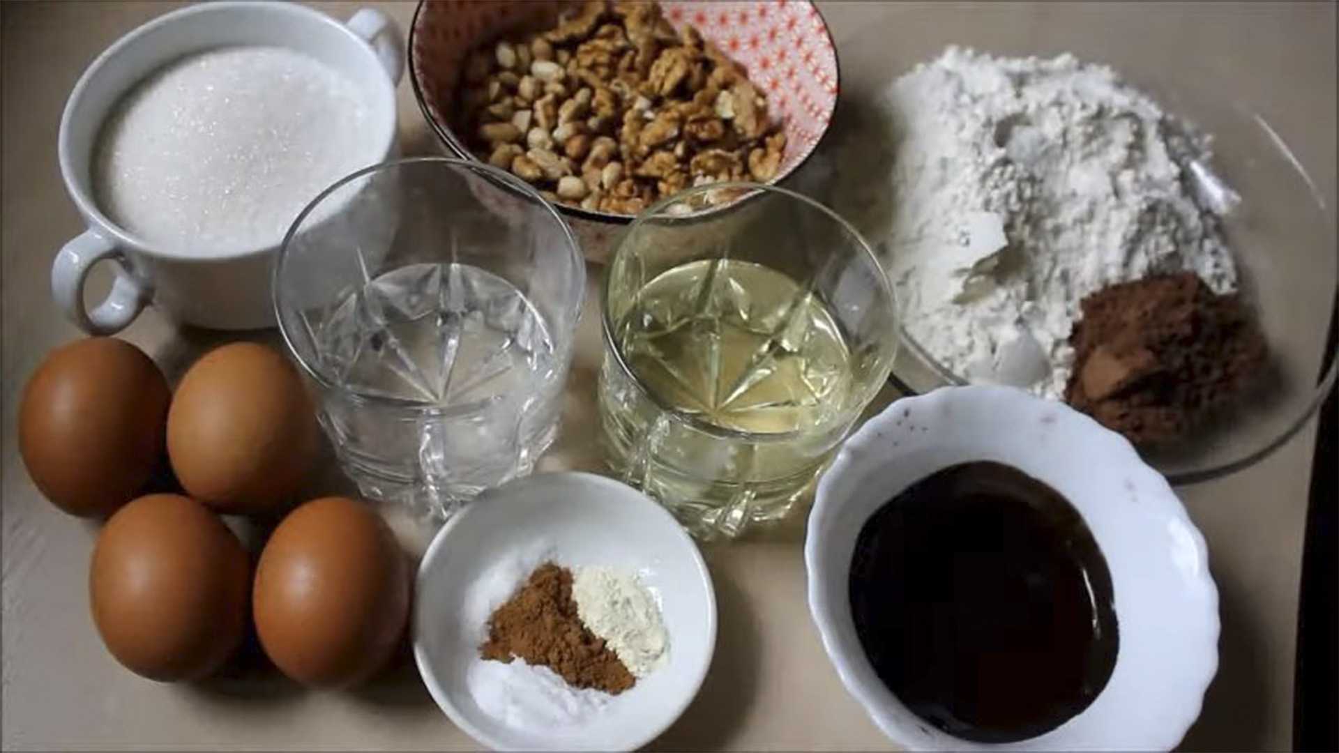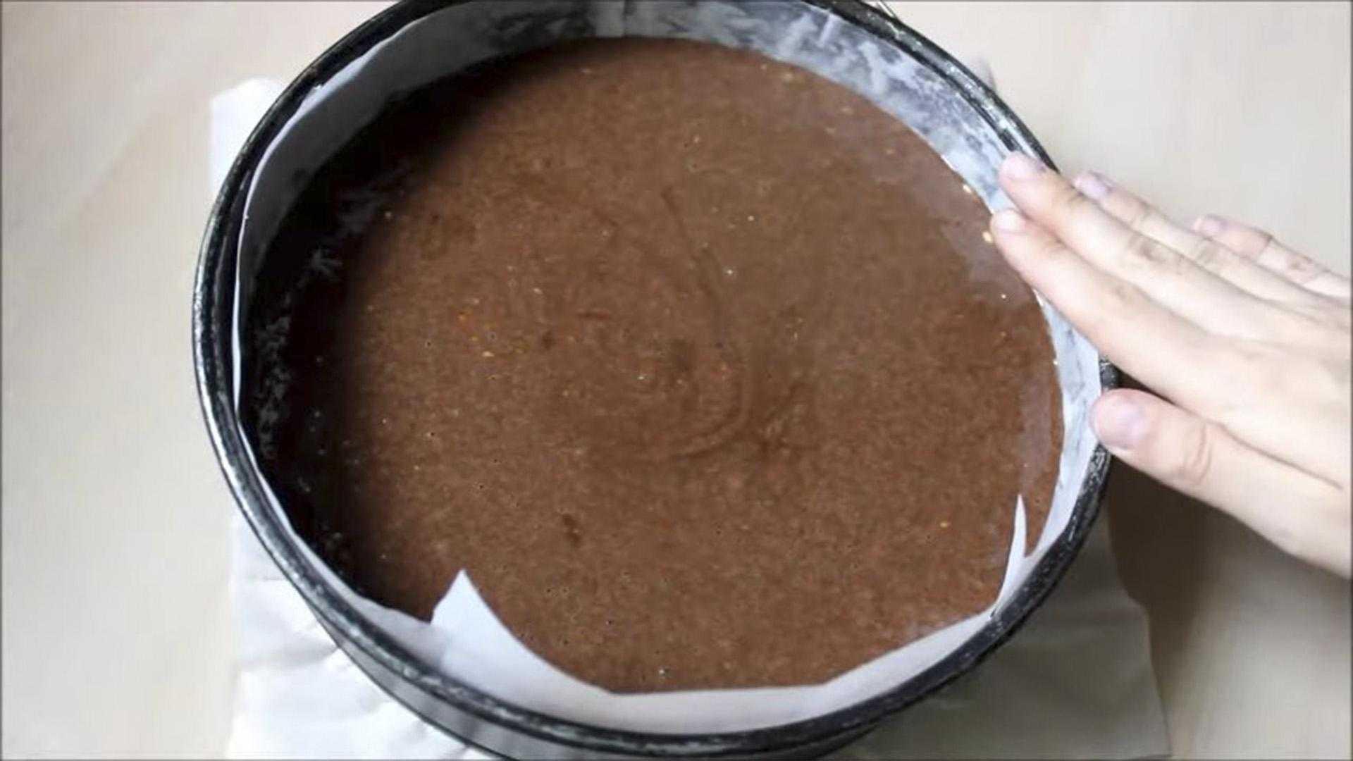 Переливаем шоколадно-ореховое тесто в форму и выпекаем бисквит в течение 50-60 минут при 180 градусах. Готовность обязательно проверяем деревянной шпажкой.