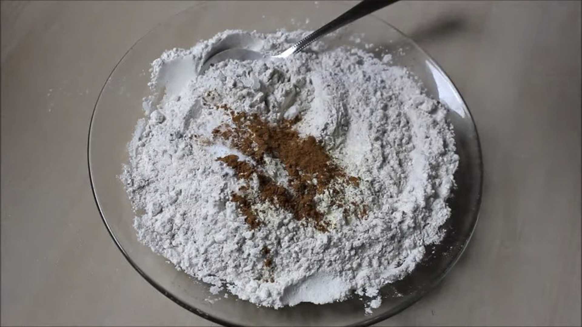 В отдельной емкости смешиваем просеянную муку, соду, соль, разрыхлитель и корицу.