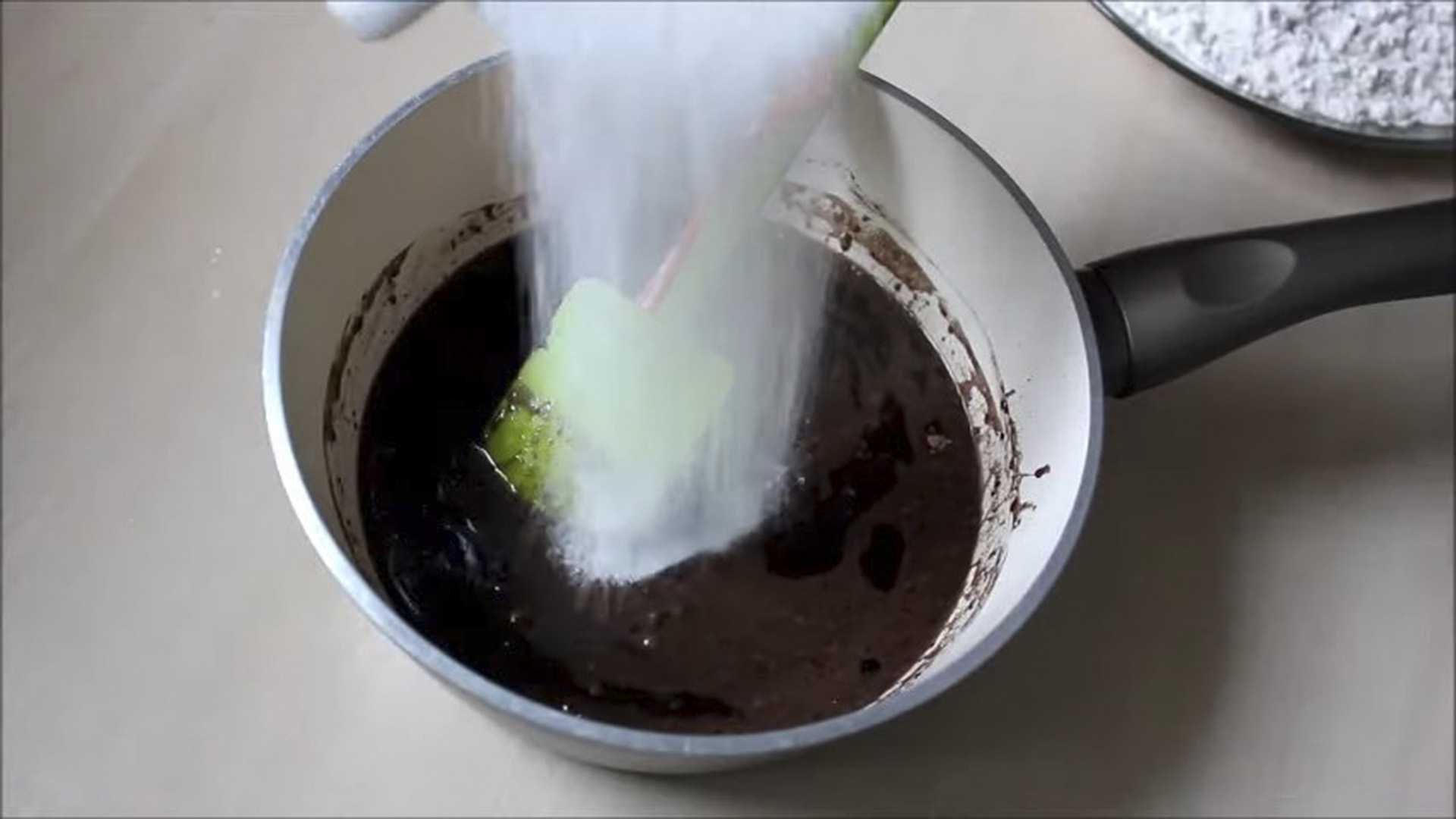 В сотейник выливаем воду, растительное масло, растопленный шоколад и всыпаем какао порошок. Слегка переименовываем ингредиенты.