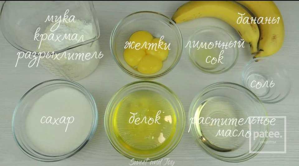 - Отделяем белки от желтков. Желтки перетираем с сахаром до белого цвета. Можно из банана сделать с помощью блендера банановое пюре и добавить его в желтки.