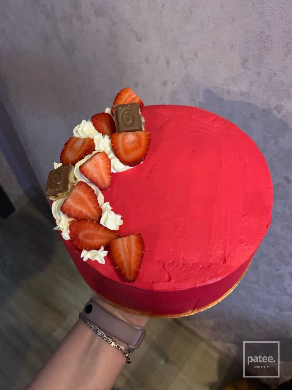 - Смазываем коржи кремом. Выкладываем на крем разрезанную пополам клубнику.