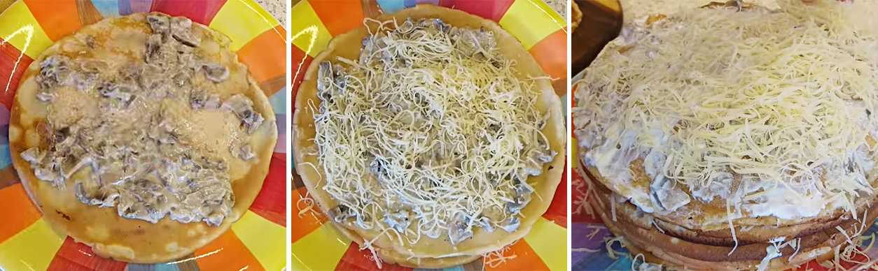 - Снова укладываем блин, покрываем грибной начинкой, сыром.
