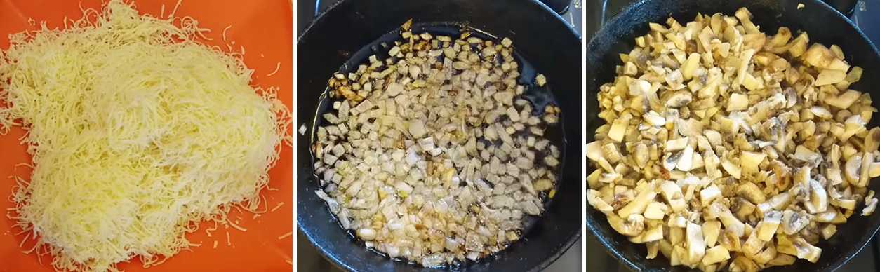 Натираем 200 грамм твердого сыра на средней терке. Нарезаем лук и слегка поджариваем его. Добавляем к луку нарезанные грибы и жарим. За 10 минут до готовности к грибам с луком добавляем сметану.
