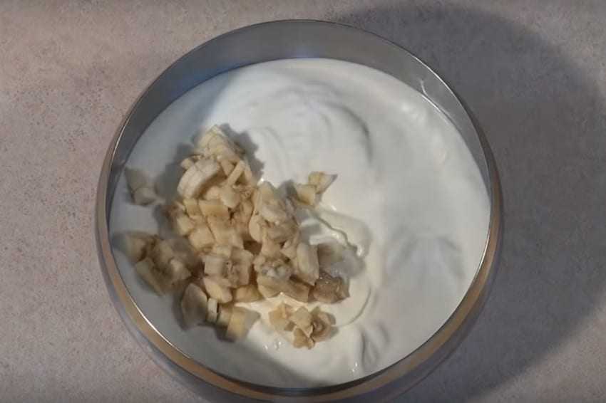 1. Возьмите отдельную емкость, вылейте в нее сметану и добавьте сахар. Нарежьте банан на небольшие кусочки, добавьте в сметанный крем и тщательно перемешайте.
