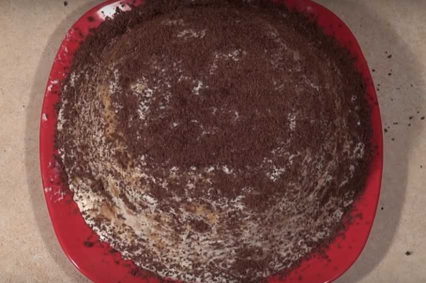 Сверху посыпьте молочный или темный шоколад. Поставьте торт в холодильник на несколько часов. Приятного аппетита!