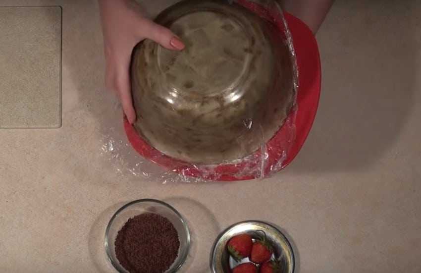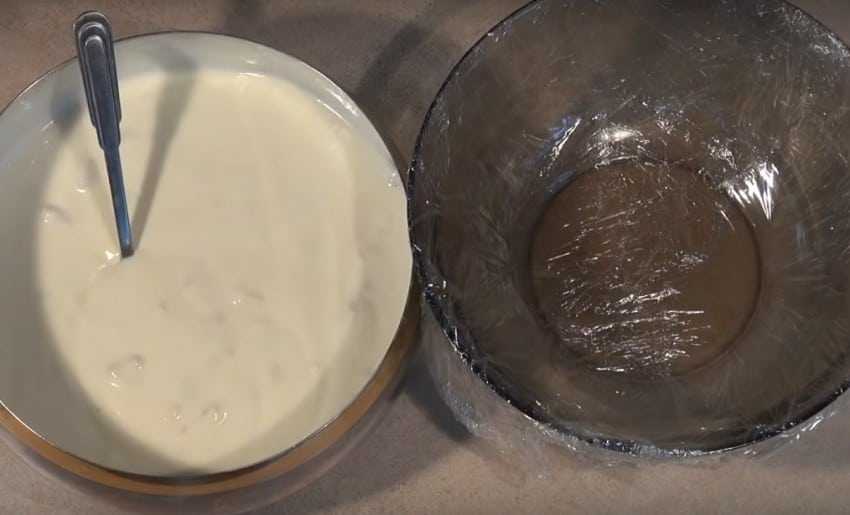 3. Возьмите глубокий салатник или миску, которая послужит формой для будущего торта. Дно необходимо выложить пищевой пленкой для более легкого извлечения готового лакомства.