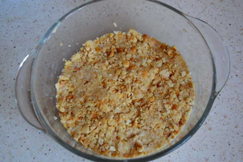 Готовую крошку из печенья пересыпаем в довольно глубокую миску. Добавляем сюда же сливочное масло, которое надо предварительно растопить. Всё перемешиваем до тех пор, пока не получится масса однородная по консистенции.