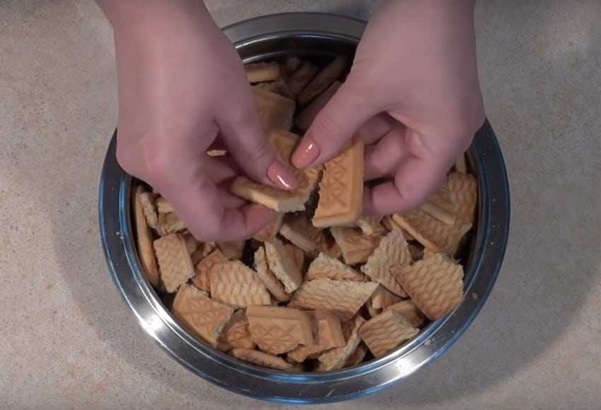 2. Печенье необходимо измельчить, можно просто поломать руками на небольшие кусочки или нарезать ножом.
