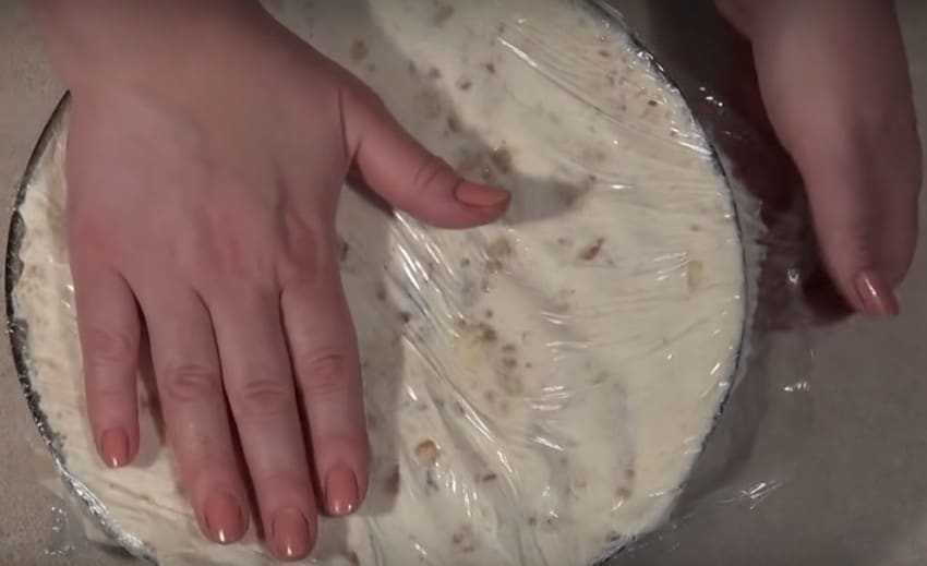 5. Верх готового торта покройте оставшимися краями пищевой пленки и немного утрамбуйте, чтобы он получился более плотным.