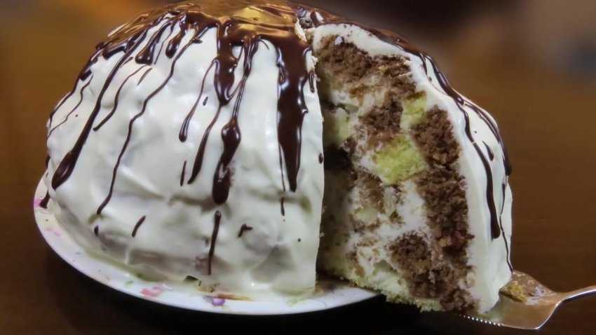 - Заливаем сверху оставшимся кремом и украшаем растопленным на водяной бане шоколадом, просто поливая тонкой струйкой из чашки.