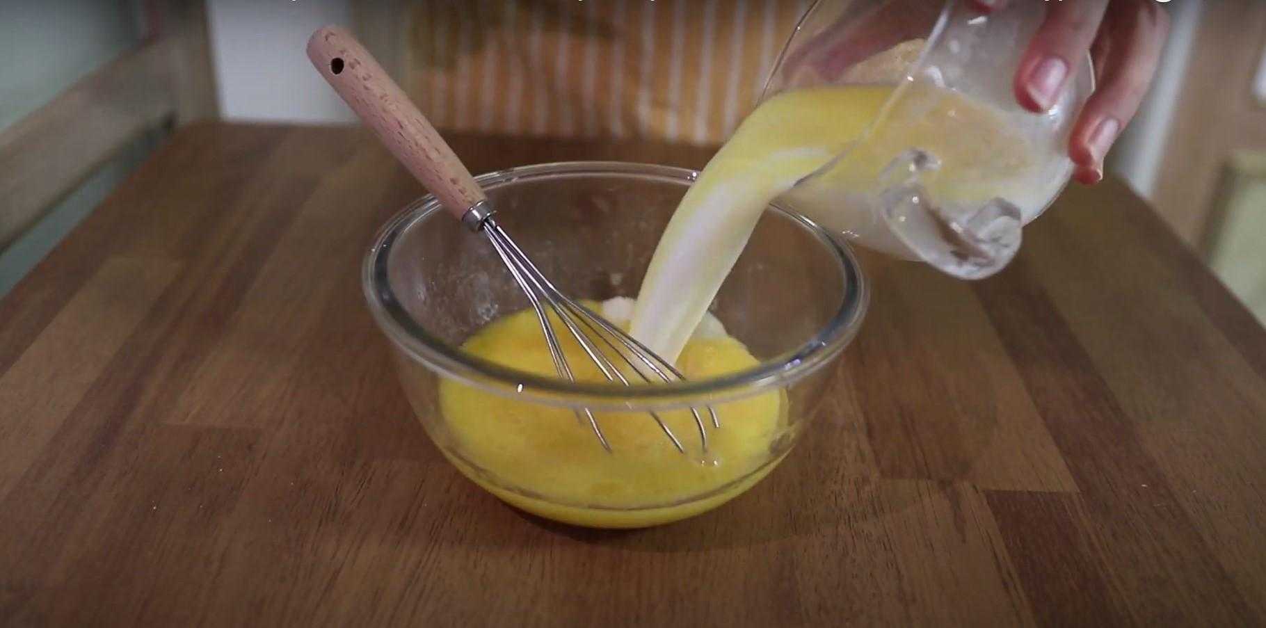 - Молоко нагреваем до комнатной температуры, вливаем к яйцам и муке. Хорошо взбиваем миксером