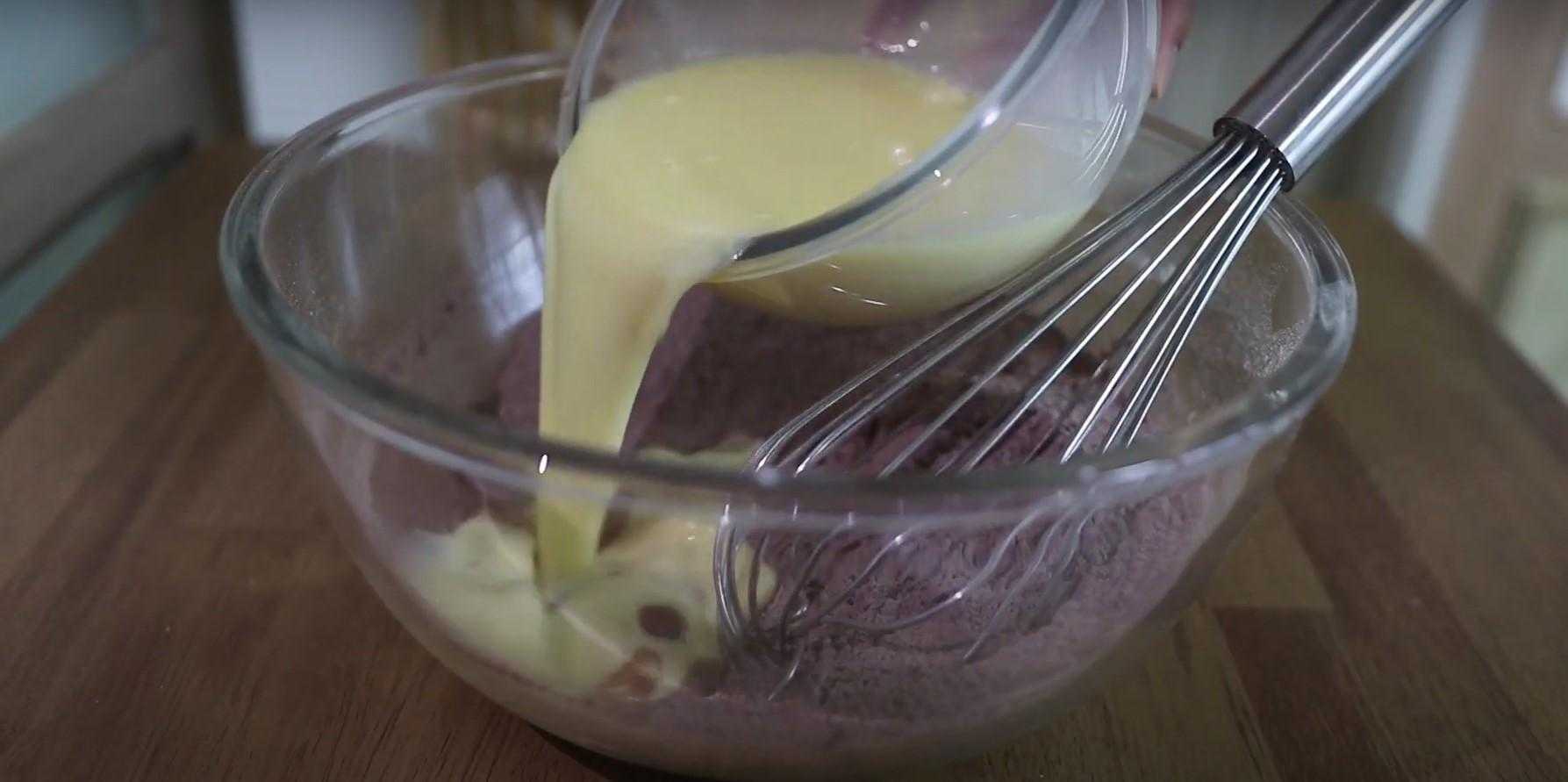 Когда сухие ингредиенты вмешались, вливаем шоколадную масляно-молочную смесь. Снова с помощью лопатки перемешиваем до получения однородной массы.