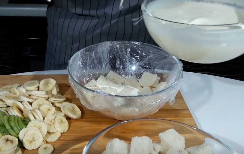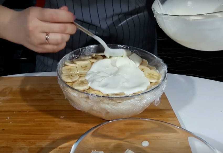 - Аккуратно смешать сметанный крем с кусочками зефира и банана.