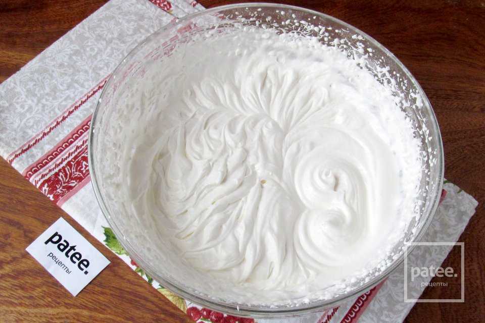 Когда пена образуется достаточно пышной, добавлять по 1 ст.л. половину сахара и продолжать взбивать, не добавляйте весь сахар сразу. Взбивать до плотных пиков.