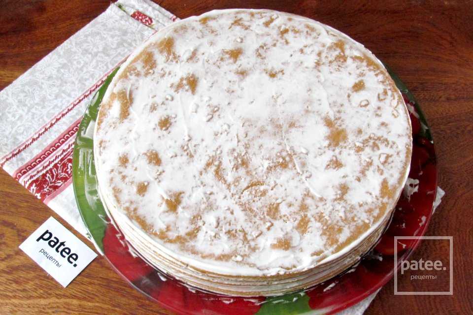 Покрываем смазанный кремом корж следующим коржом, снова смазываем кремом и так собираем весь торт. Поверхность и бока “Медовика” тоже смазываем кремом.