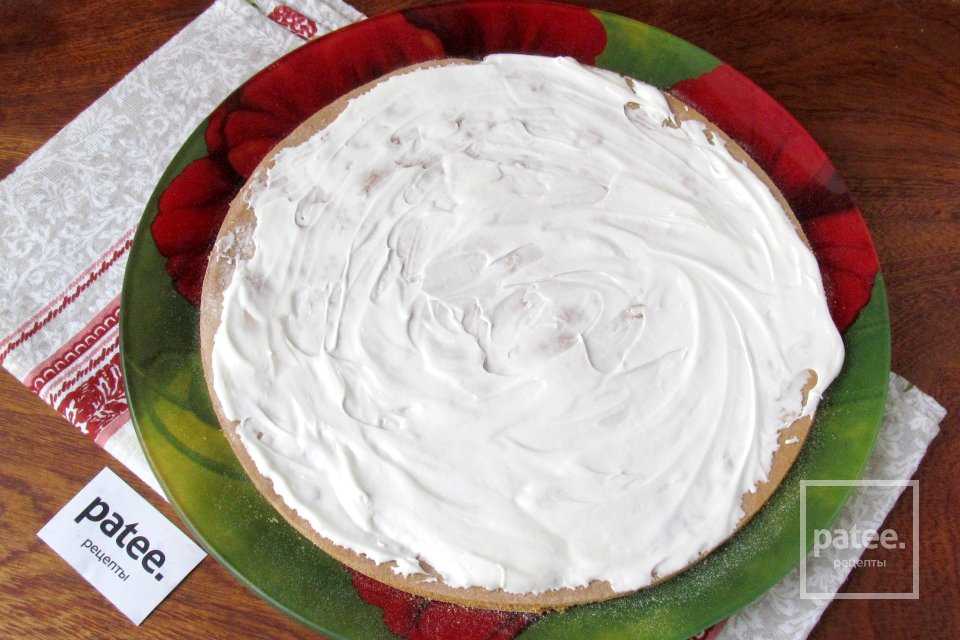 Выкладываем на широкое плоское блюдо один медовый корж, смазываем его частью сливочного крема.