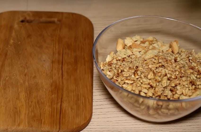 1. Приготовьте основу. В глубокую миску поместите крошку из топленого печенья, размером примерно по 1-1,5 см кусочек.