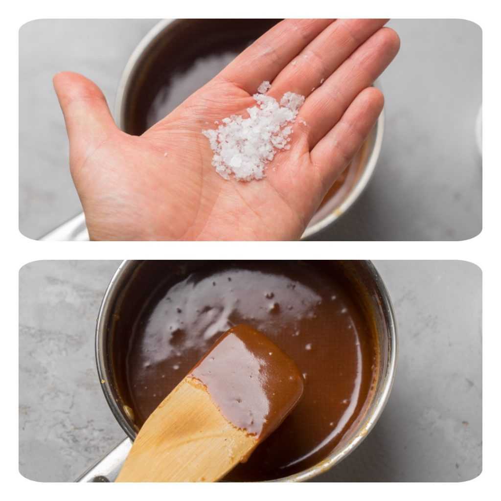Солёная карамель может быть непредсказуемой. Иногда карамель может расслоиться. Где-то была завышена температура, а масло при резком нагревании распадется на жир и воду, и после остывания вода останется снизу, а жирная масса сверху. Чтобы карамель не расслаивалась, мало добавляйте небольшими частями и хорошо вмешивайте. Продолжайте мешать после того, как добавили все ингредиенты и выключили огонь.