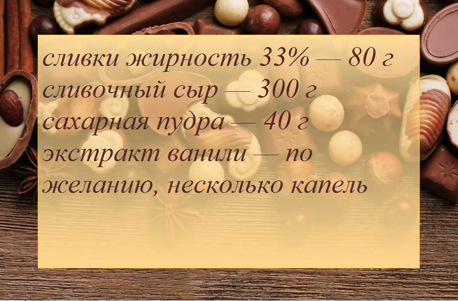 Взбейте 450 мл сливок с сахарной пудрой и сыром в пышную массу. Остальные 50 мл сливок добавьте в шоколад и растопите на водяной бане.