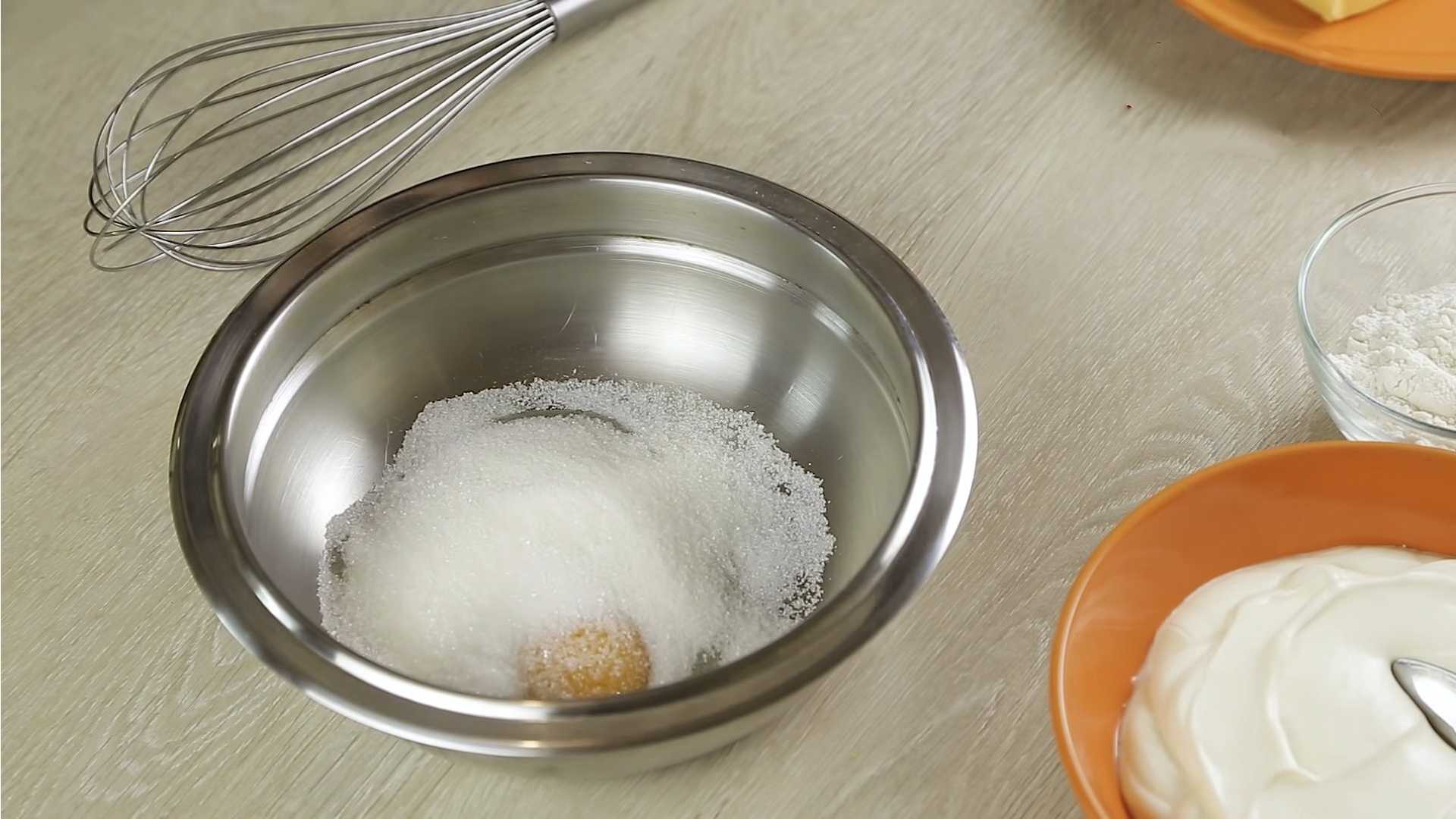 В миску разбиваем яйцо, высыпаем сахар, ваниль и размешиваем.