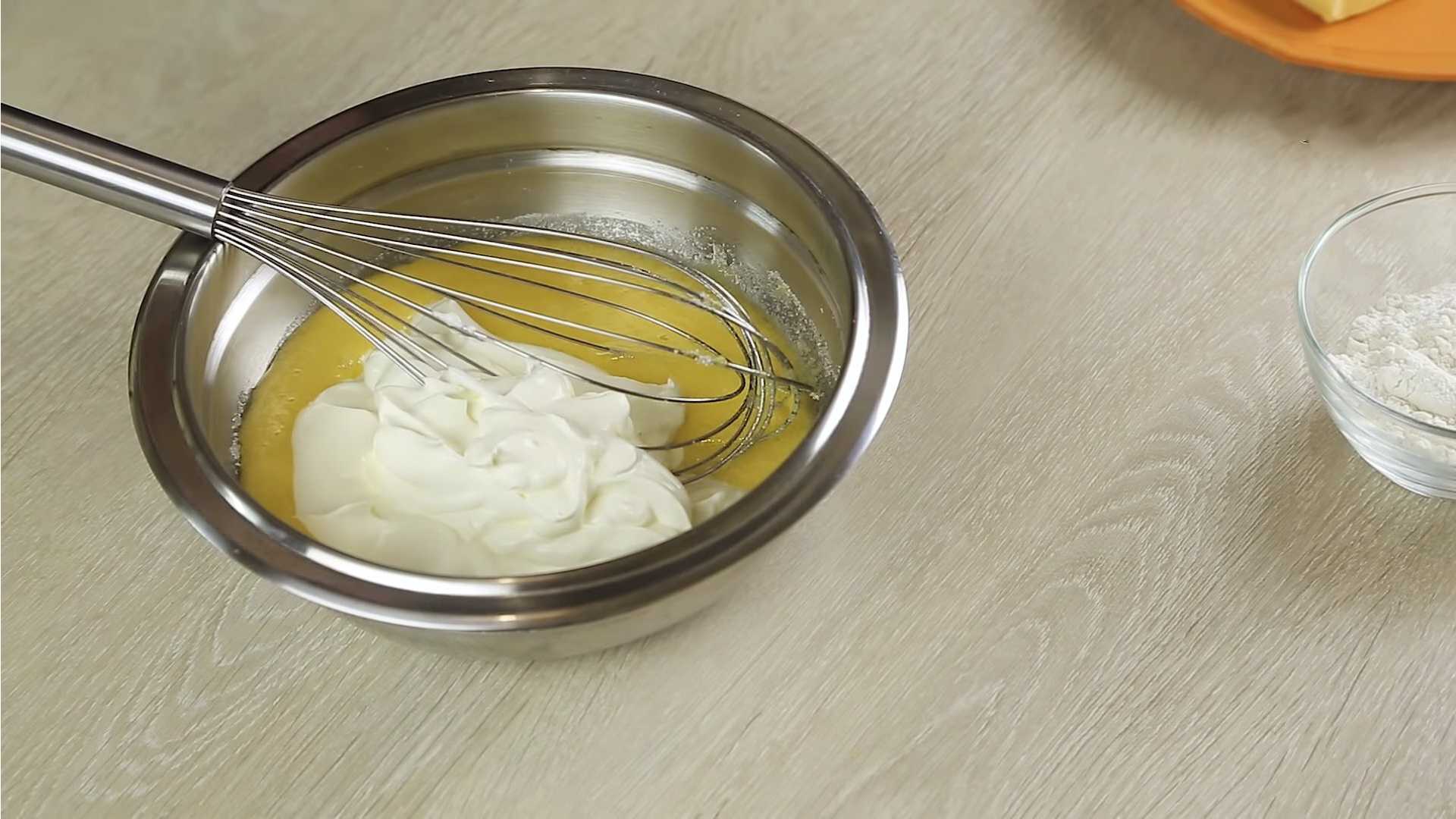- Сахарный песок соединить с мукой и желтками, затем добавить молоко, после чего размешать.