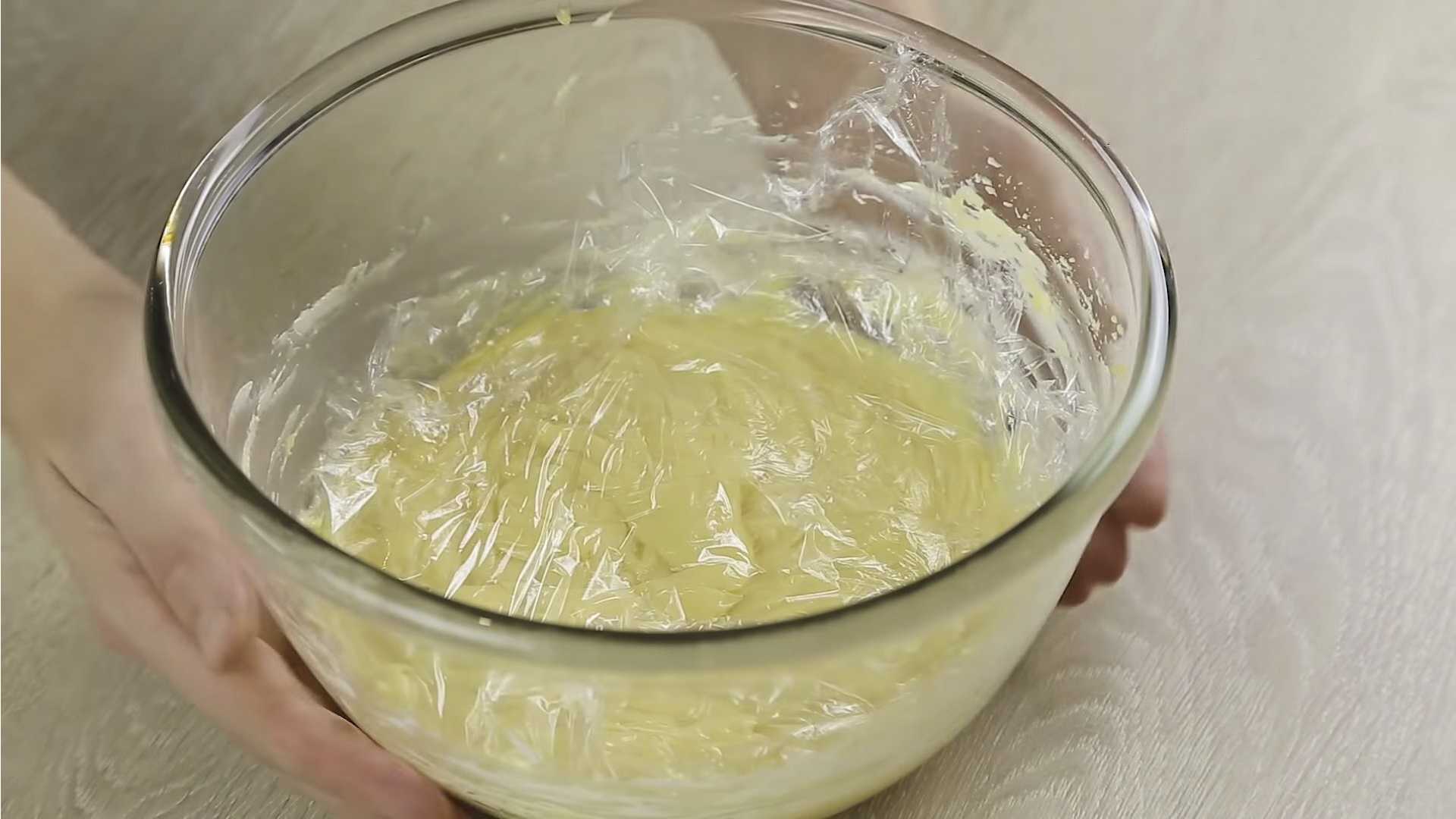 Готовый крем накрываем пищевой пленкой в контакт и отправляем в холодильник на 30-40 мин.