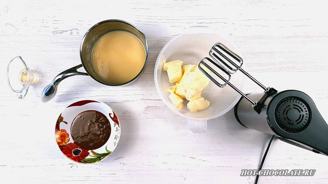 Шоколад для рецепта распускают в небольшой кастрюльке, установив ее на водяную баню. Если при добавлении растопленной плитки крем расслоился, посуду устанавливают в горячую воду и повторяют взбивание.