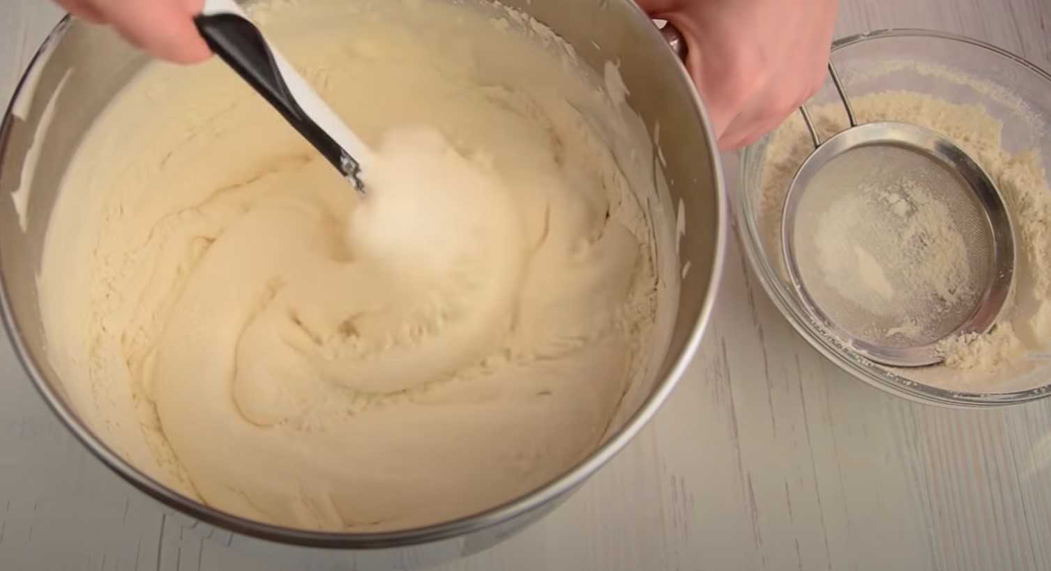 Переложите тесто к оставшимся белкам и продолжите вымешивать снизу вверх. Действовать нужно аккуратно, но уверенно, чтобы масса не осела.