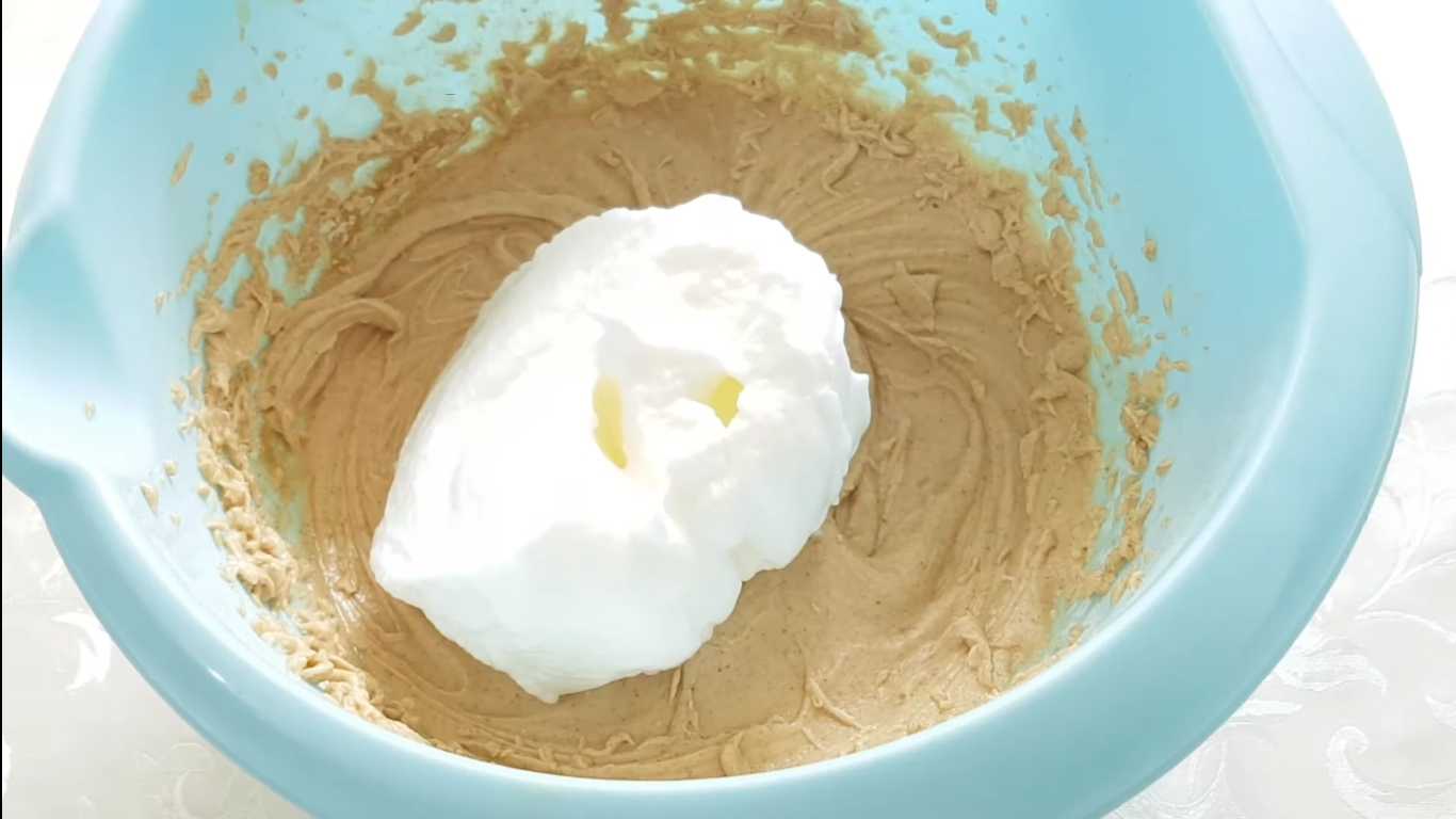 Добавляем белки в медовую массу и аккуратно вымешиваем, чтобы тесто не осело.
