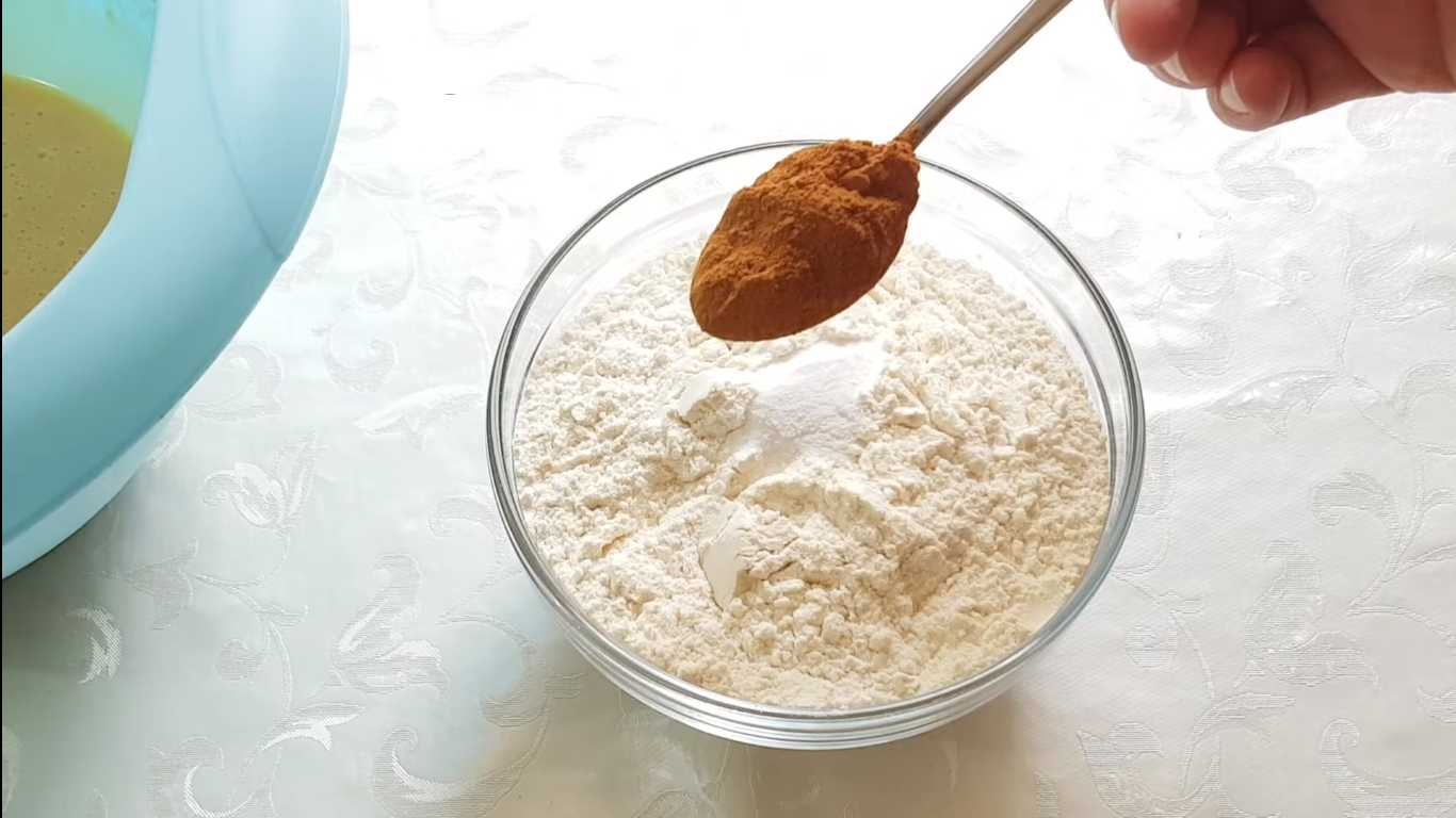 Всыпаем просеянную муку, соду и корицу.