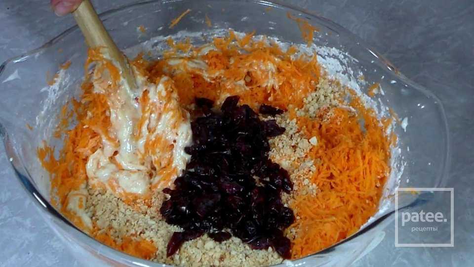 - В устойчивую пену из яиц и сахара ввести растительное масло, муку, соду с разрыхлителем, цедру и сок апельсина, морковь и орехи. Тщательно перемешать тесто.