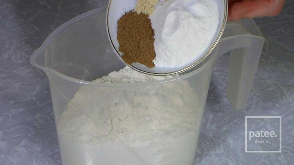 В просеянную муку добавить соль, разрыхлитель теста, мускатный орех, корицу и имбирь, всё перемешать.