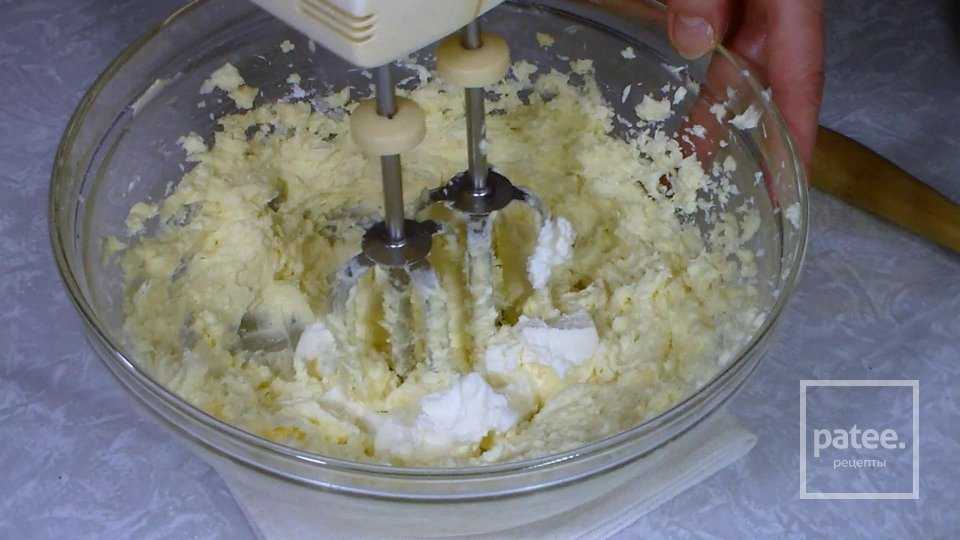 В это время можно начинать готовить крем. Взбиваем до пышной массы масло, сахарную пудру, экстракт ванили и творог.