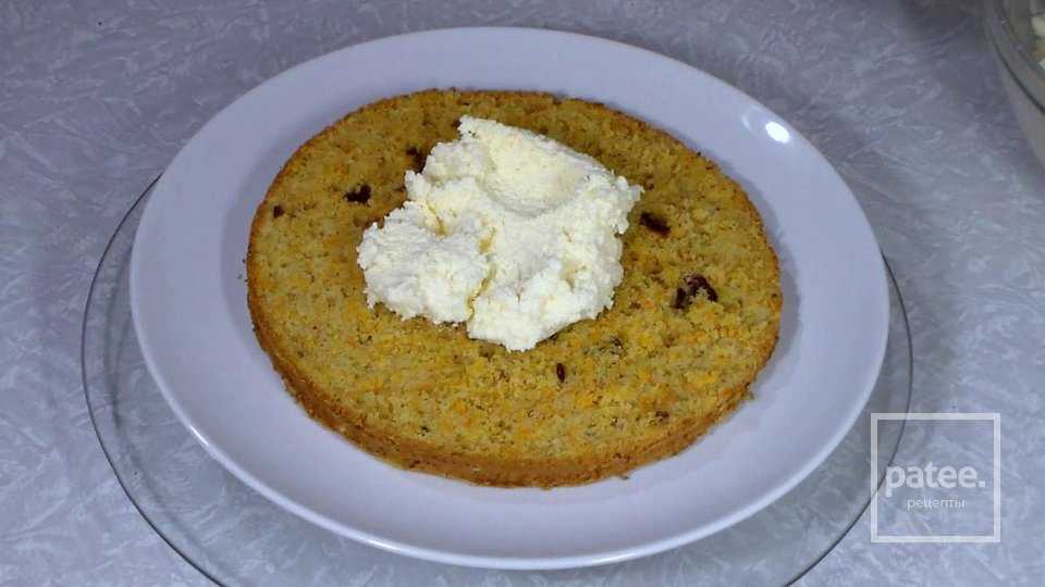 Соберите морковный торт: на блюдо выложите один корж и покройте его слоем сливочного крема. Далее выложите второй корж и также покройте его кремом.