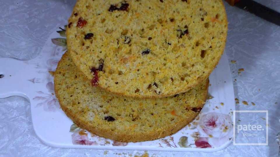Полностью остывший бисквит разрежьте на 3 равных коржа.