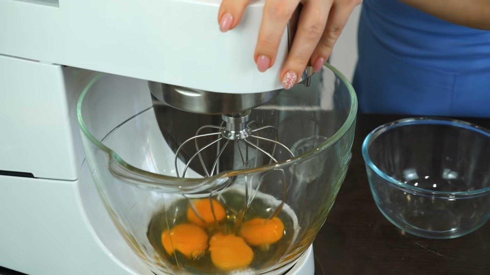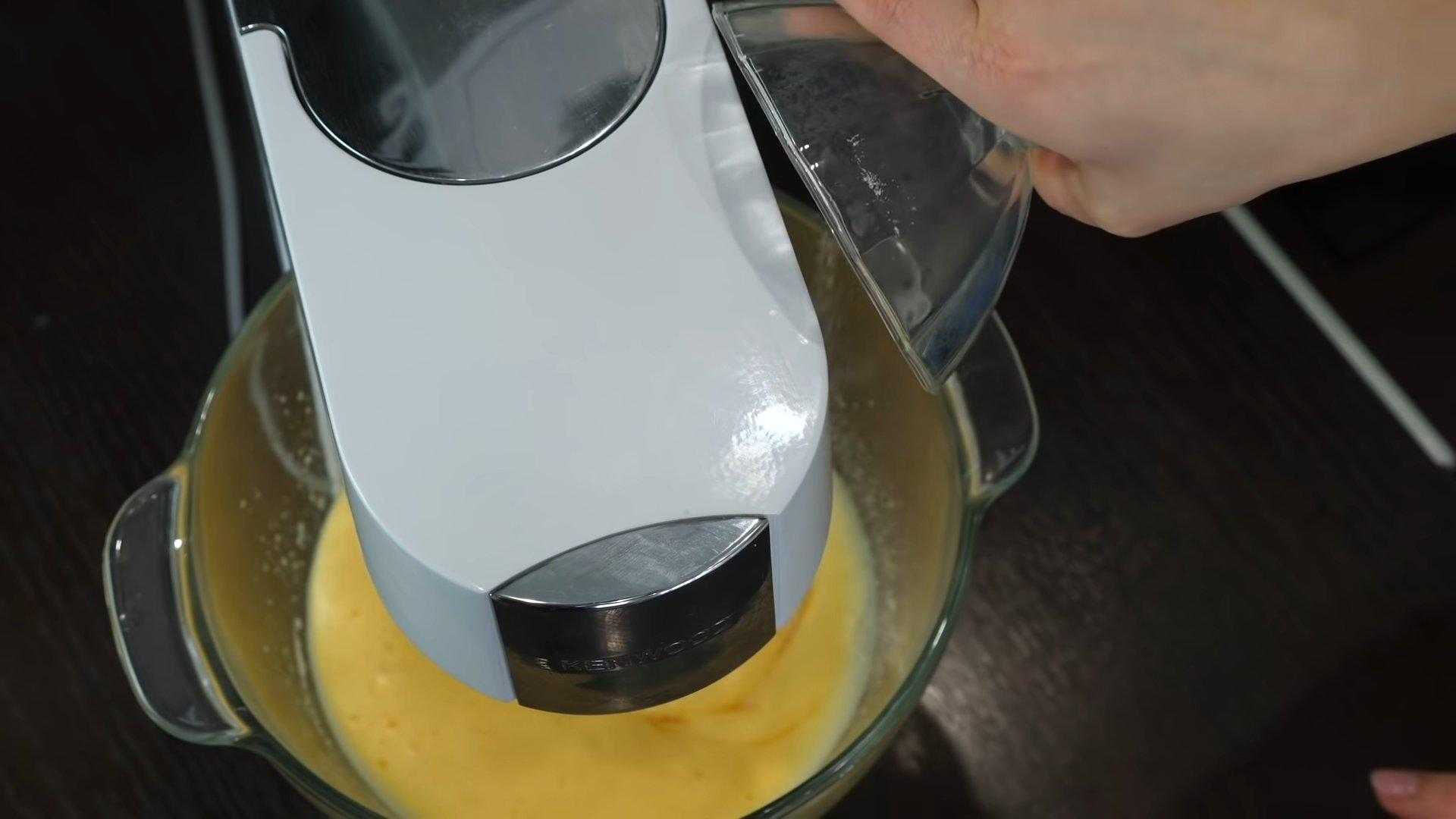 5. И только потом добавляю яйца, по одному. Скорость миксера, при этом, я делаю минимальную. Затем скорость увеличиваю до максимальной и взбиваю секунд 20.