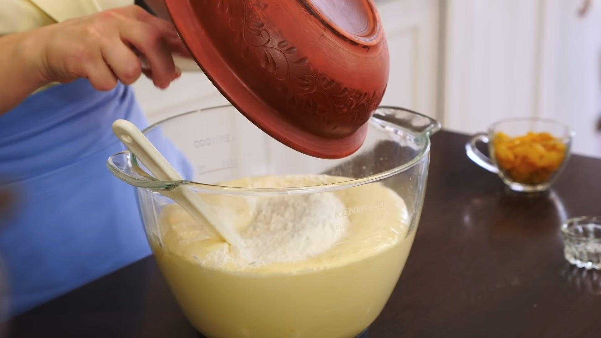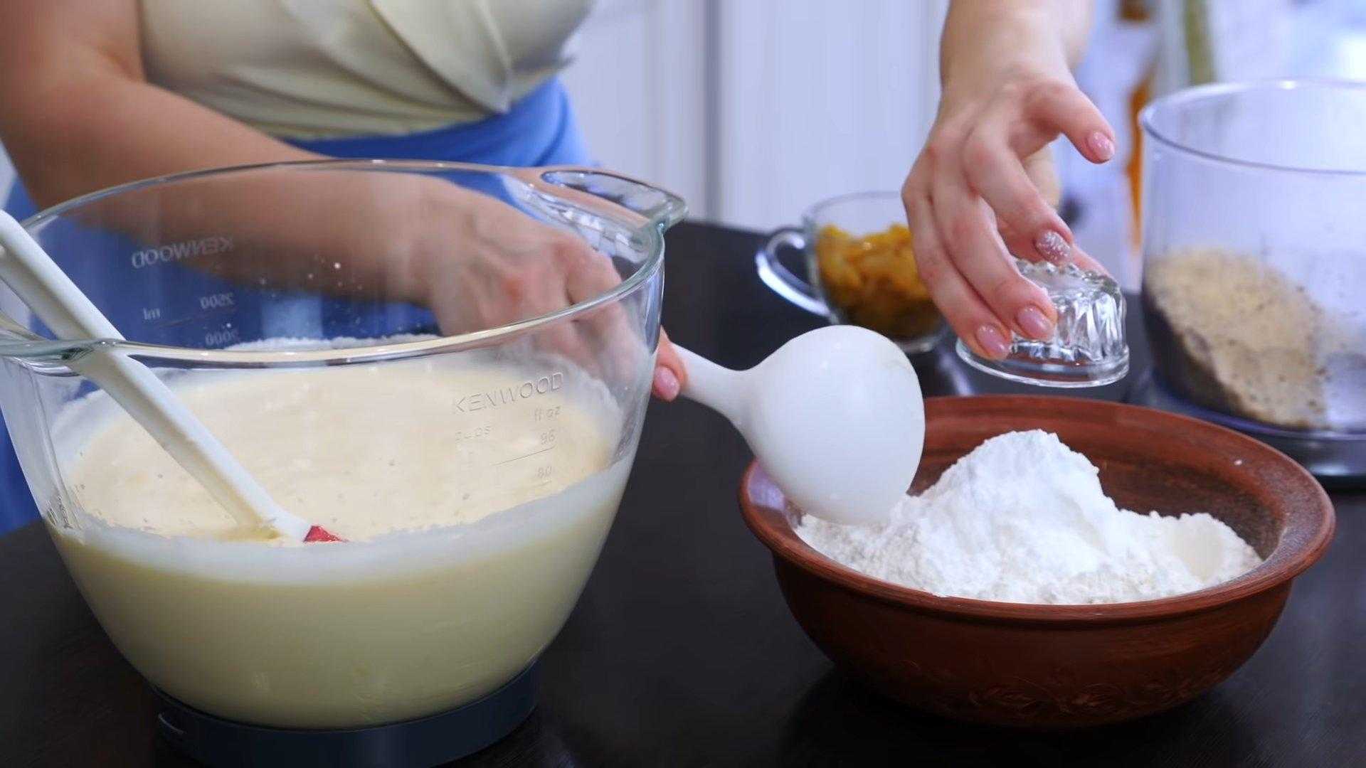 - В полученный состав положить разрыхлитель, насыпать муку и замесить мягкое тесто.