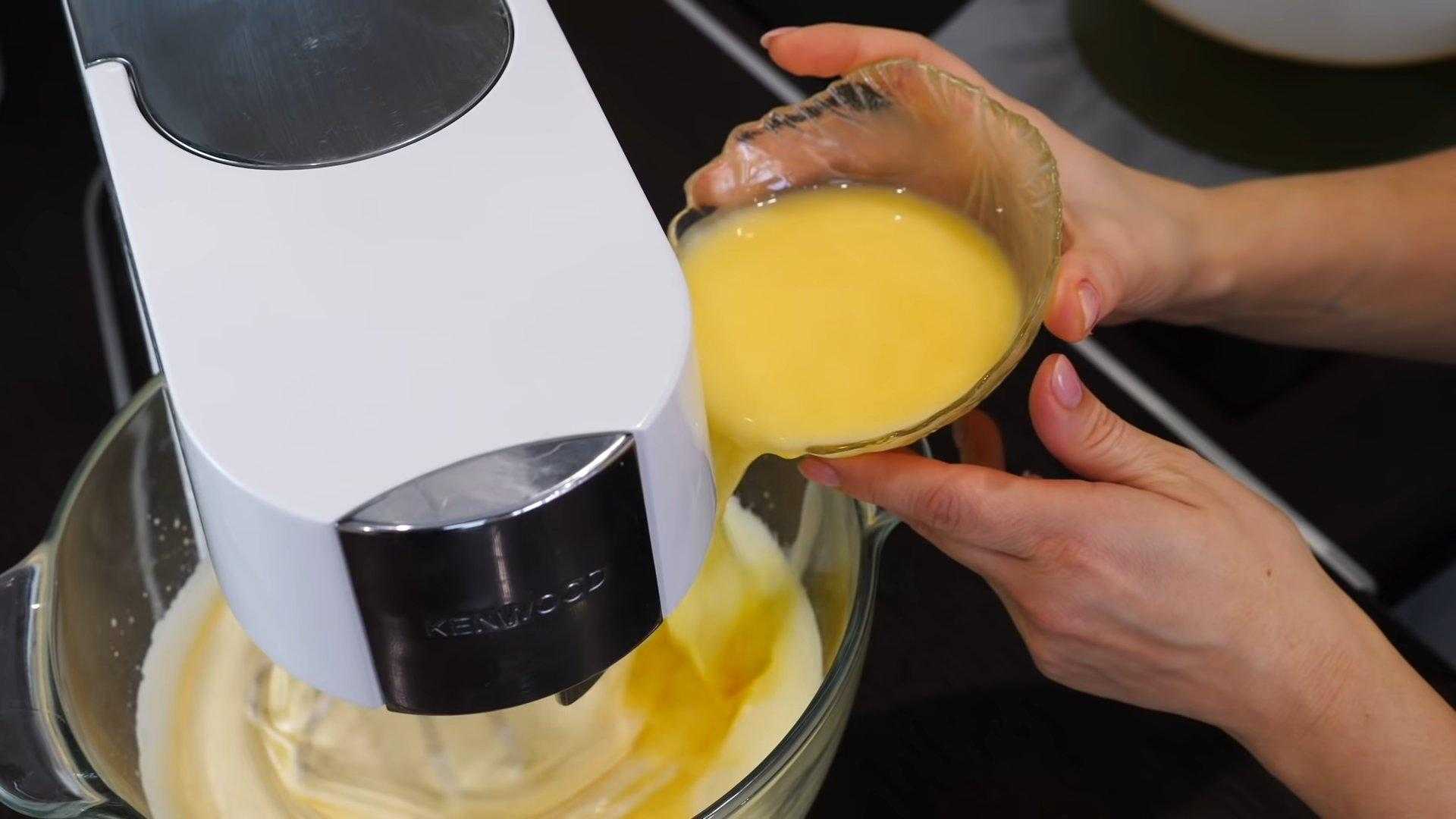 Сливочное масло растапливаем, вливаем в яичную массу и перемешиваем все до однородности.