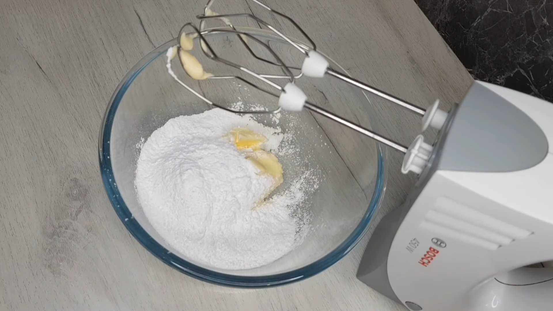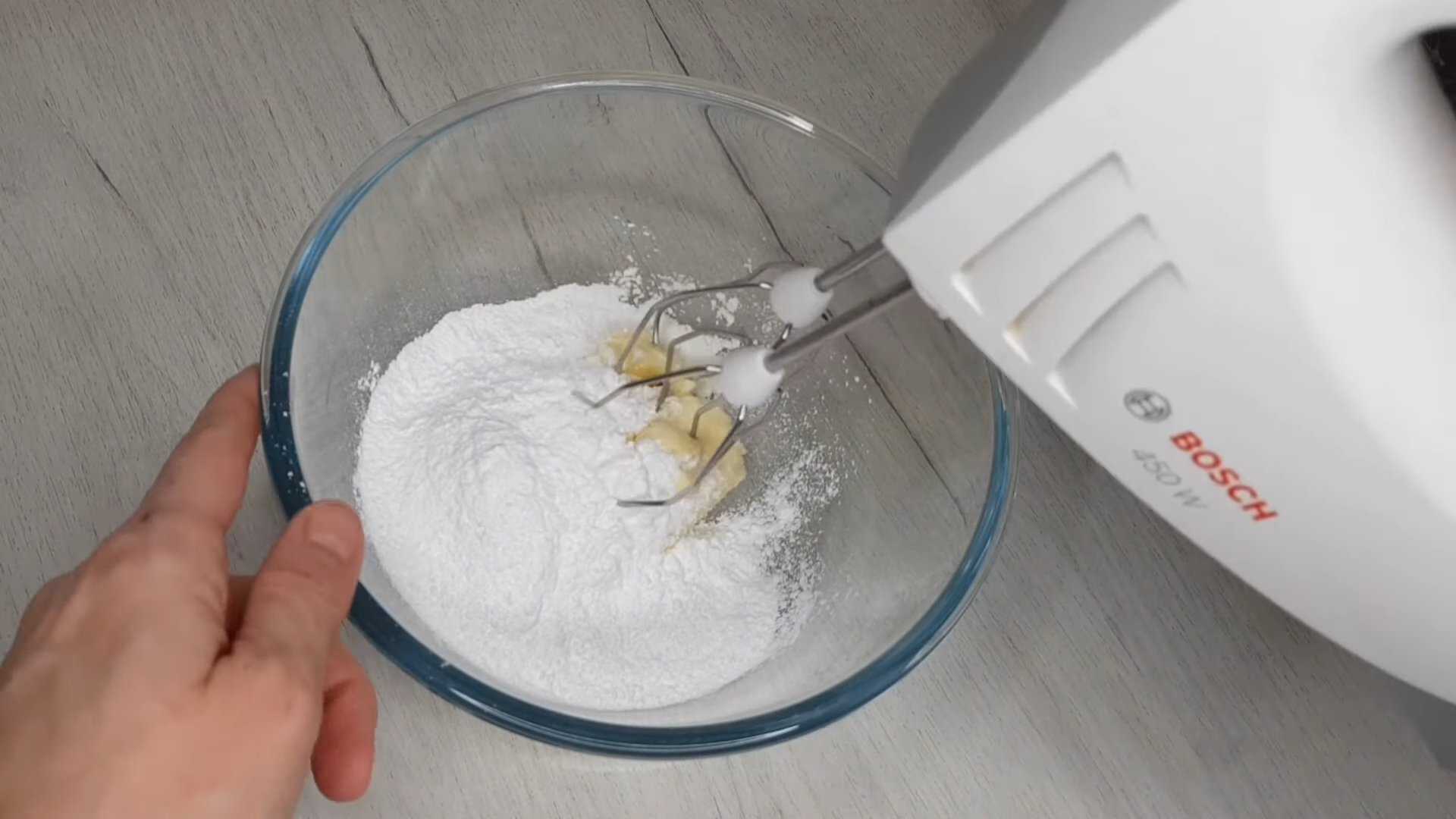 - Выбирают в миксере среднюю или высокую скорость. С его помощью пудру и масло превращают в пышный однородный состав.