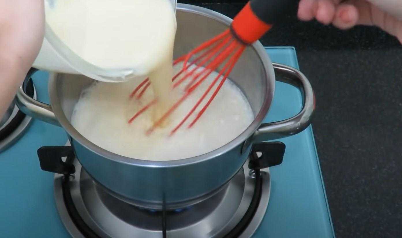 Оставшееся в емкости молоко возвращаем на газ и теперь вливаем в него молочно-крахмальную смесь и тщательно перемешиваем.